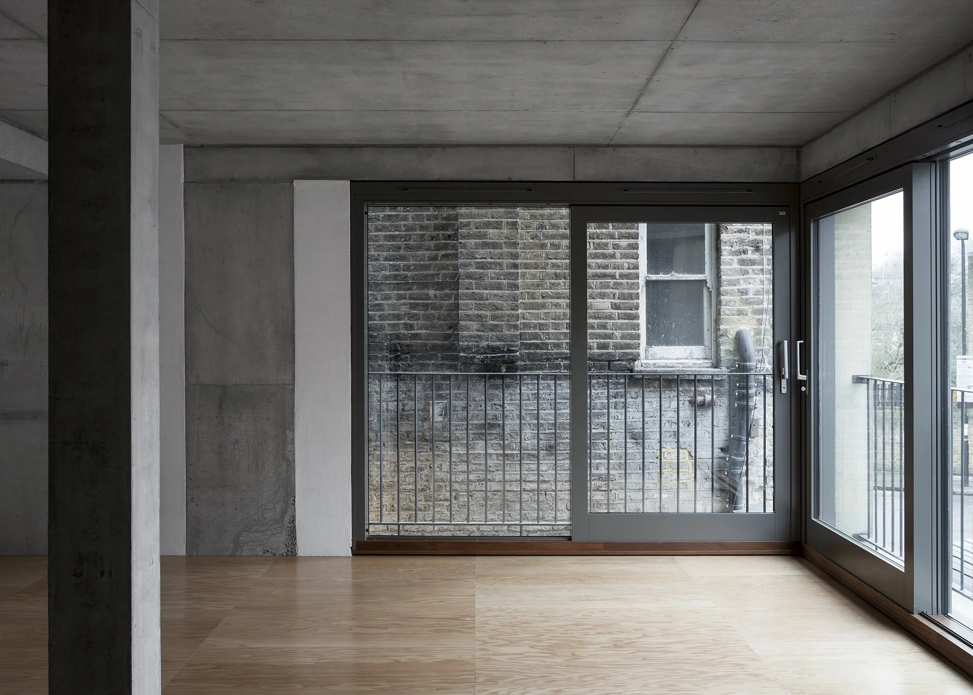 A new build project consisting of 3 new flats within a black boxy massing. Exposed structural concrete runs throughout, complemented by a modest material palette of plywood and painted brick.