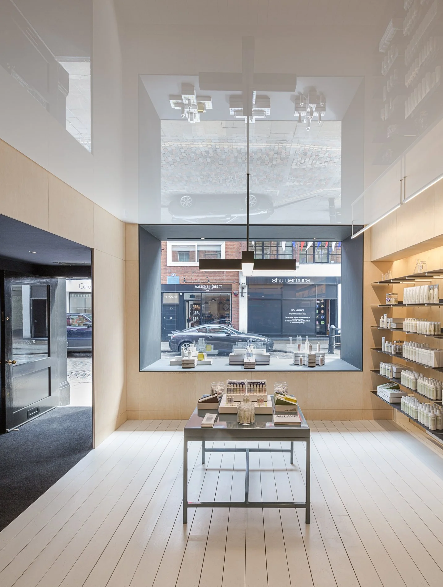 Set on the quietly elegant Monmouth Street in Covent Garden, The second London apothecary by Malin & Goetz was designed by Jonathan Tuckey to mirror the theatrical qualities of the surrounding neighbourhood. The large, boxy window edged in black sets up a diorama-like view into the store, which is illuminated by Vasiliki Malakasi's lighting designs. A velvet-lined entrance recreates the experience of entering a West End show while pale wood floors and birch plywood walls set up an arresting contrast, creating a zen environment within.